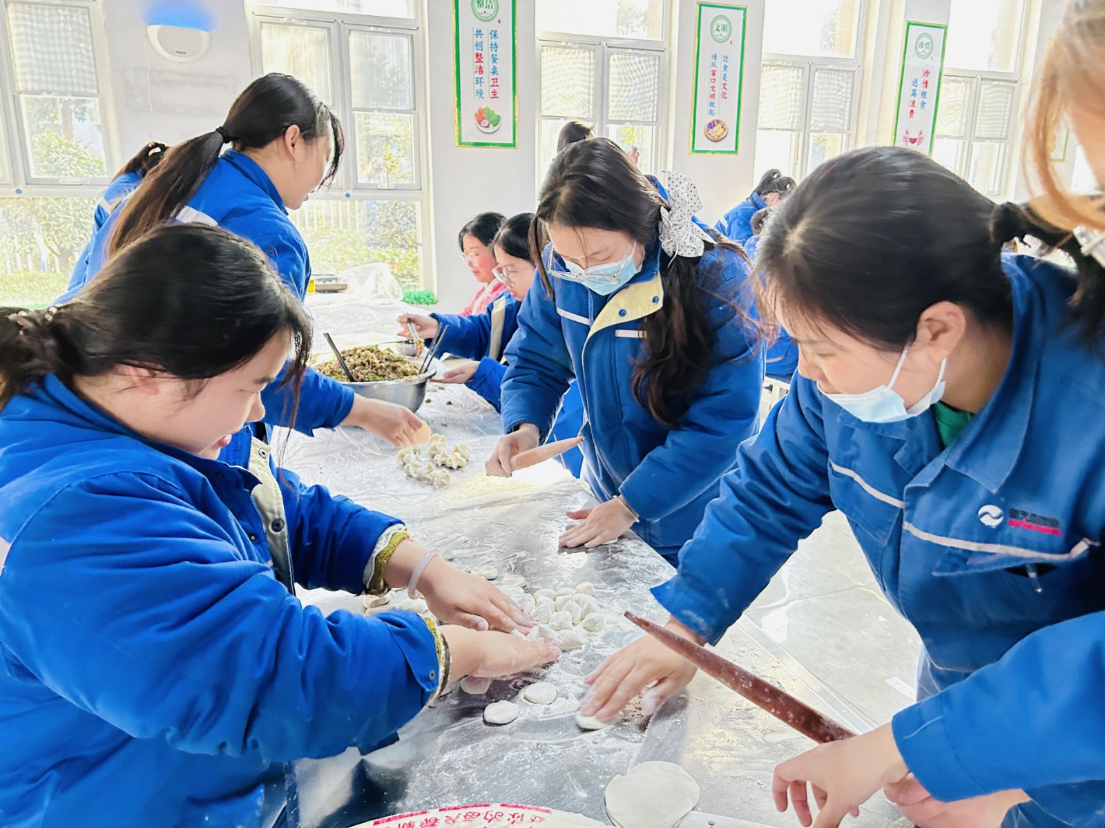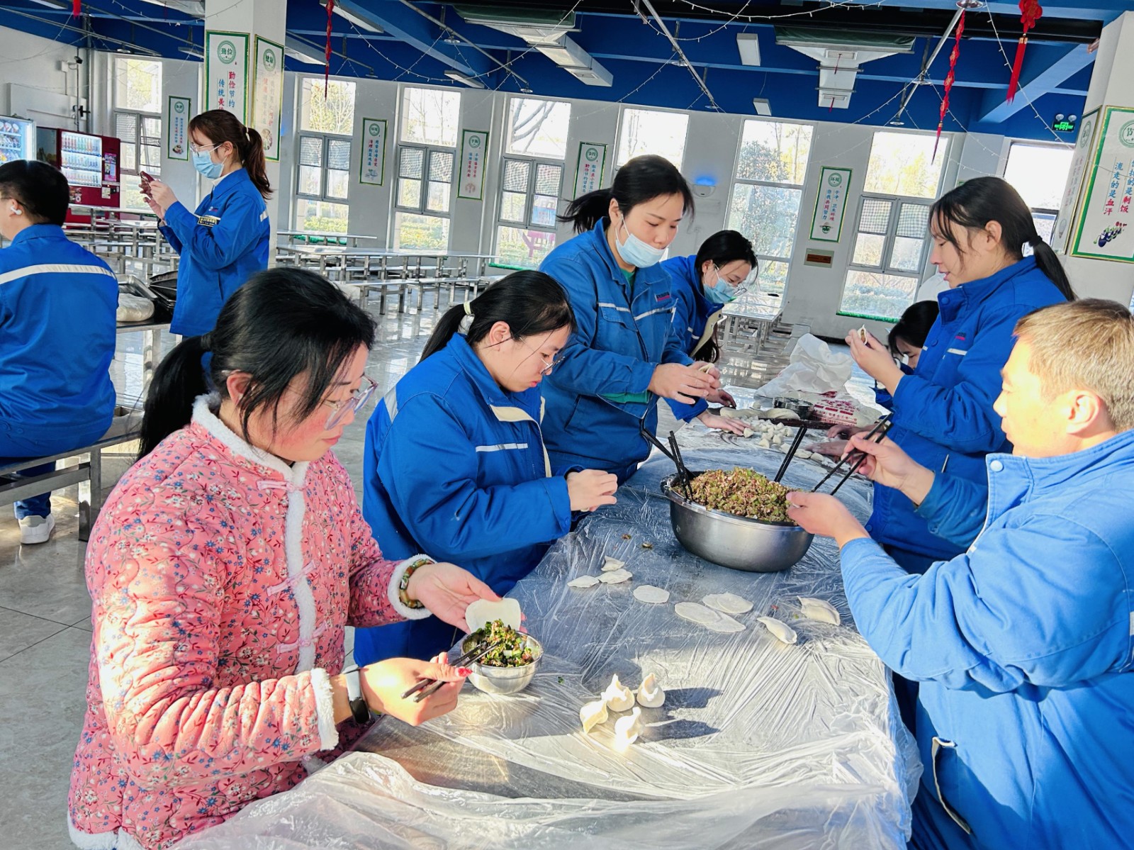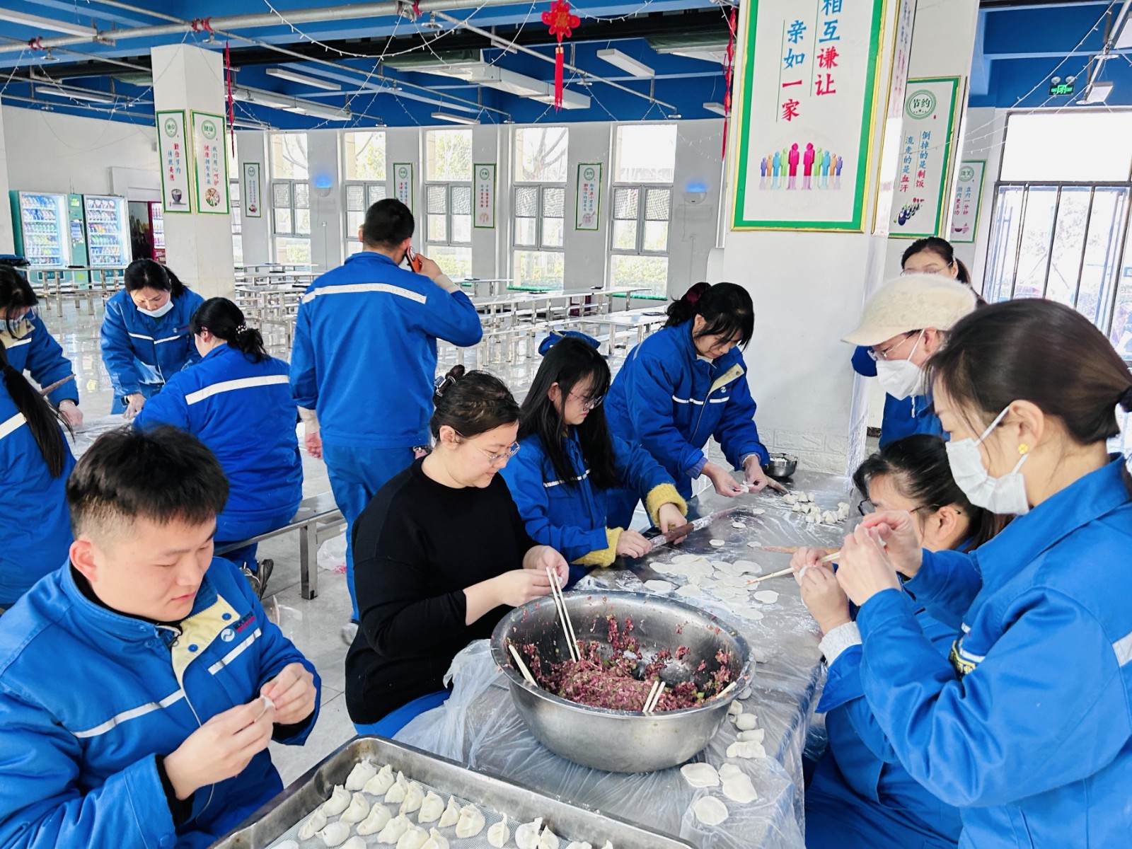 冬至不端饺子碗,冻掉耳朵没人管。12月21日冬至上午,公司在餐厅组织“浓浓饺子香,暖暖冬至情”包饺子活动,让来自天南地北的新天地人在这个特殊的冬日感受到公司大家庭的温暖。活动中,员工们分成几组围在桌前,你擀皮,我捏馅、她装盘......动作熟练,配合默契,在欢声笑语中,“精神抖擞”的一盘盘饺子很快呈现在大家眼前.....